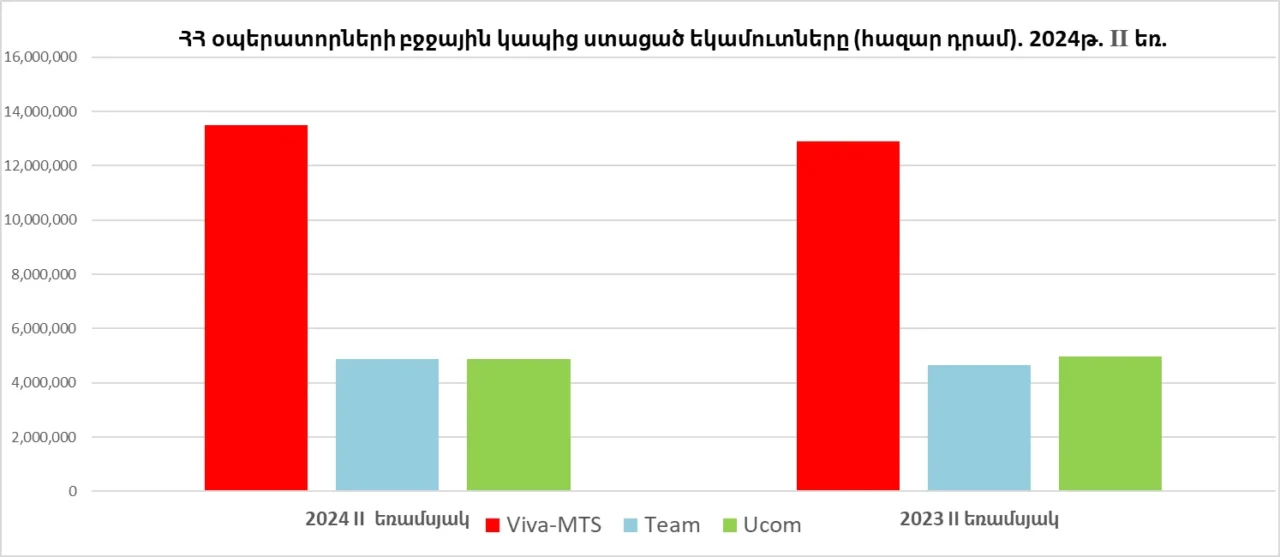 Մասնավորապես, 2024 թվականի II եռամսյակում նախորդ տարվա համադրելի ցուցանիշի համեմատ Viva-ի եկամուտներն աճել են 617.03 մլն ՀՀ դրամով կամ 4.79%-ով և կազմել 13.51 մլրդ ՀՀ դրամ։ Team Telecom-ի եկամուտներն աճել են 234.31 մլն ՀՀ դրամով կամ 5.04%-ով և կազմել 4.89 մլրդ ՀՀ դրամ։ Ucom-ի գործառնական եկամուտները նվազել են 119.28 մլն ՀՀ դրամով կամ 2.39%-ով` կազմել 4.87 մլրդ ՀՀ դրամ։