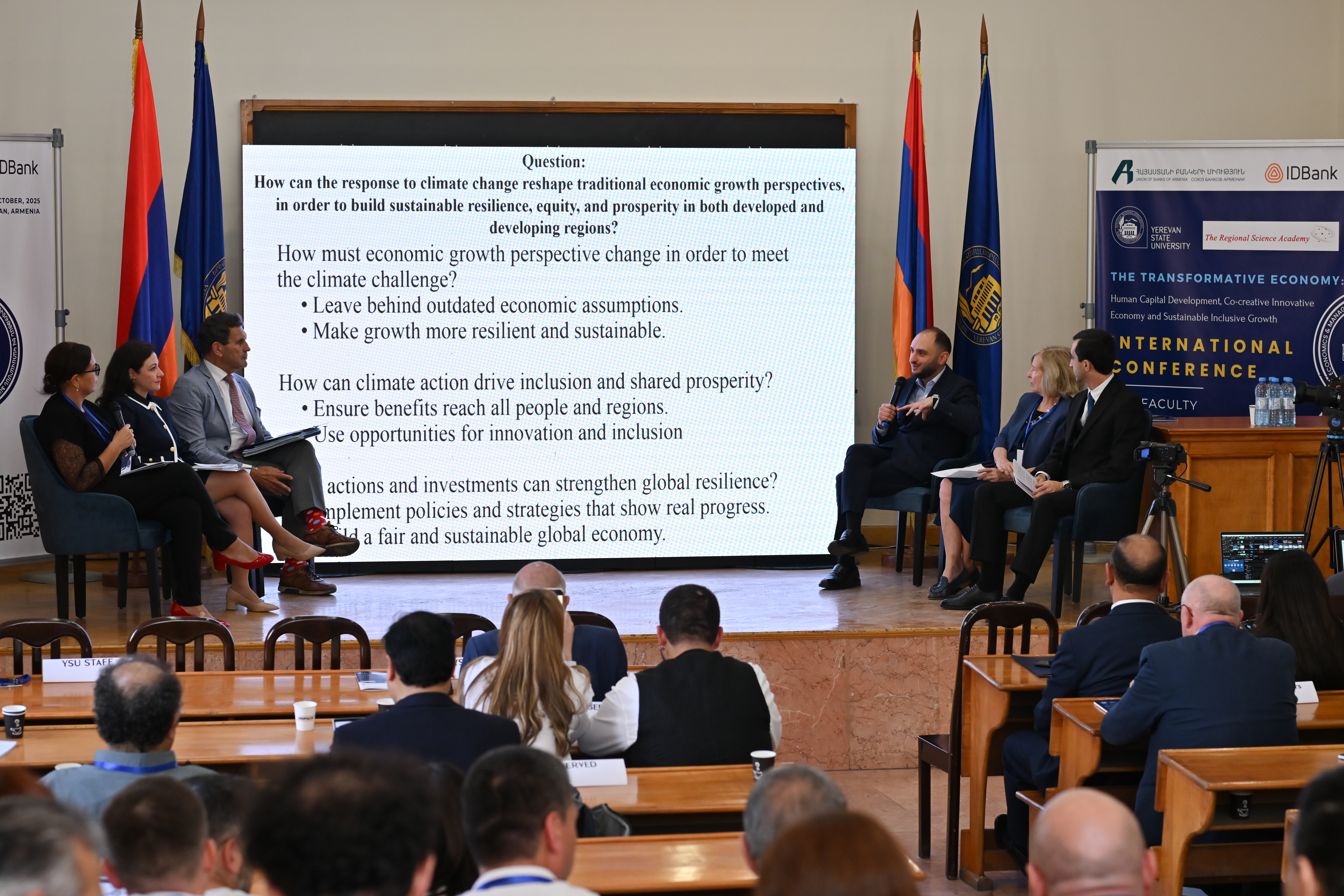 «Վերաիմաստավորելով աճը հանուն կլիմայական ավելի ճկուն ապագայի» թեմայով պանելային քննարկման թիրախում գլխավոր հարցը սա է՝ ինչպե՞ս կարող է մաքուր էներգիային անցումը վերաձևակերպել տնտեսական աճի մոդելները և ապահովել կայունություն, համաչափ զարգացում և բարօրություն ինչպես զարգացած, այնպես էլ զարգացող տարածաշրջաններում։ Բանախոսների շարքում է IDBank-ի Կորպորոտիվ բանկինգի գծով տնօրենի տեղակալ Երվանդ Ասլանյանը։