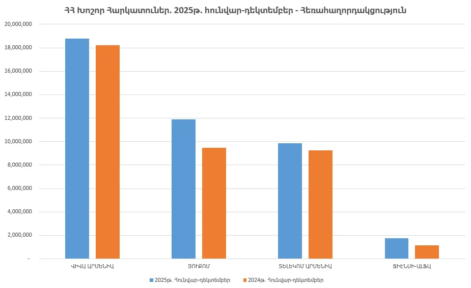2025թ.-ի հունվար-դեկտեմբերին Հայաստանի խոշոր հեռահաղորդակցական ընկերությունների մուծած հարկերի ծավալն աճել է 10.96%-ով