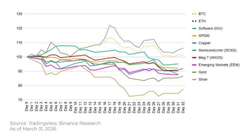 Հորմուզի նեղուցի ճգնաժամը ազդեց համաշխարհային նավթի շրջանառության մոտ 20%-ի վրա՝ առաջացնելով Brent նավթի գների կտրուկ 36% աճ և VIX անկայունության ինդեքսը հասցնելով 35-ի գագաթնակետին: Այս պայմաններում դասական տնտեսական տեսությունը կանխատեսում էր փախուստ դեպի անվտանգ ապաստարաններ, բայց 2026 թվականի իրականությունը շրջեց հին դոգմաները: Binance Research-ի զեկույցի համաձայն, հակամարտության սկզբից ի վեր (առաջին 32 օրվա ընթացքում) Bitcoin-ը (BTC) և Ethereum-ը (ETH) համապատասխանաբար +1% և +6% եկամտաբերություն են ցույց տվել՝ հասնելով +14% և +22% գագաթնակետերի։