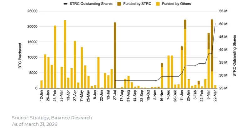 2026 թվականի մարտը նշանավորվեց կորպորատիվ Bitcoin պահուստների կառավարման «նոր նախագծի» ի հայտ գալով: Strategy-ն սկսեց ագրեսիվ ընդլայնում՝ օգտագործելով Stretch Preferred Shares (STRC) առաջարկը: Միայն մարտին Strategy-ն այս գործիքի միջոցով ներգրավեց 1.56 միլիարդ դոլար՝ օգտագործելով այդ միջոցների 50%-ը Bitcoin գնելու համար: Ընդհանուր առմամբ, ընկերությունը 2026 թվականին կուտակել է մոտ 90,000 BTC՝ 7.25 միլիարդ դոլար արժողությամբ, տասն անգամ ավելի, քան 2022 թվականի արջային շուկայի ընթացքում կատարված գնումները: