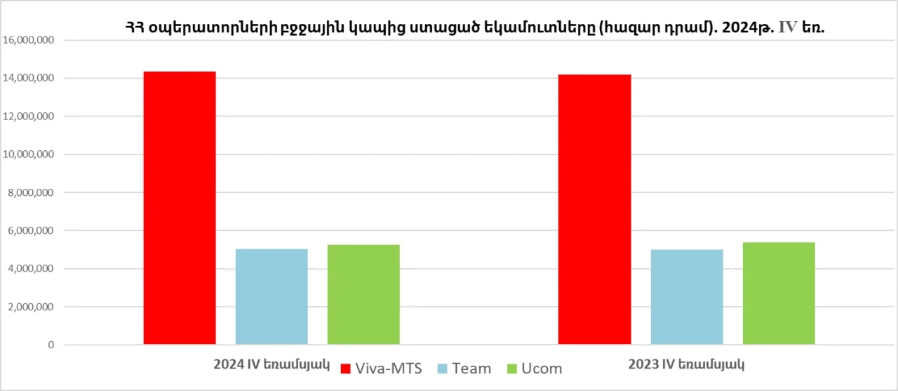 Մասնավորապես, 2024 թվականի IV եռամսյակում նախորդ տարվա համադրելի ցուցանիշի համեմատ Viva-ի եկամուտներն աճել են 102.92 մլն ՀՀ դրամով կամ 0.75%-ով և կազմել 14.33 մլրդ ՀՀ դրամ։ Team Telecom-ի եկամուտները նվազել են 156.7 մլն ՀՀ դրամով կամ 3.02%-ով և կազմել 5.18 մլրդ ՀՀ դրամ։ Իսկ Ucom-ի գործառնական եկամուտները նվազել են 57.6 մլն ՀՀ դրամով կամ 1.09%-ով` կազմել 5.30 մլրդ ՀՀ դրամ։