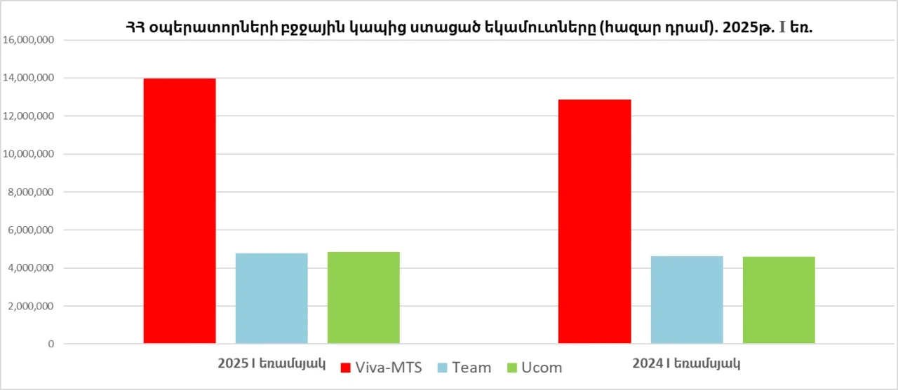 Մասնավորապես, 2025 թվականի I եռամսյակում նախորդ տարվա համադրելի ցուցանիշի համեմատ Viva-ի եկամուտներն աճել են 1.09 մլրդ ՀՀ դրամով կամ 8.51%-ով և կազմել 13.96 մլրդ ՀՀ դրամ։ Team Telecom-ի եկամուտները աճել են 140.2 մլն ՀՀ դրամով կամ 3.03%-ով և կազմել 4.77 մլրդ ՀՀ դրամ։ Իսկ Ucom-ի գործառնական եկամուտները աճել են 256.5 մլն ՀՀ դրամով կամ 5.60%-ով` կազմել 4.83 մլրդ ՀՀ դրամ։