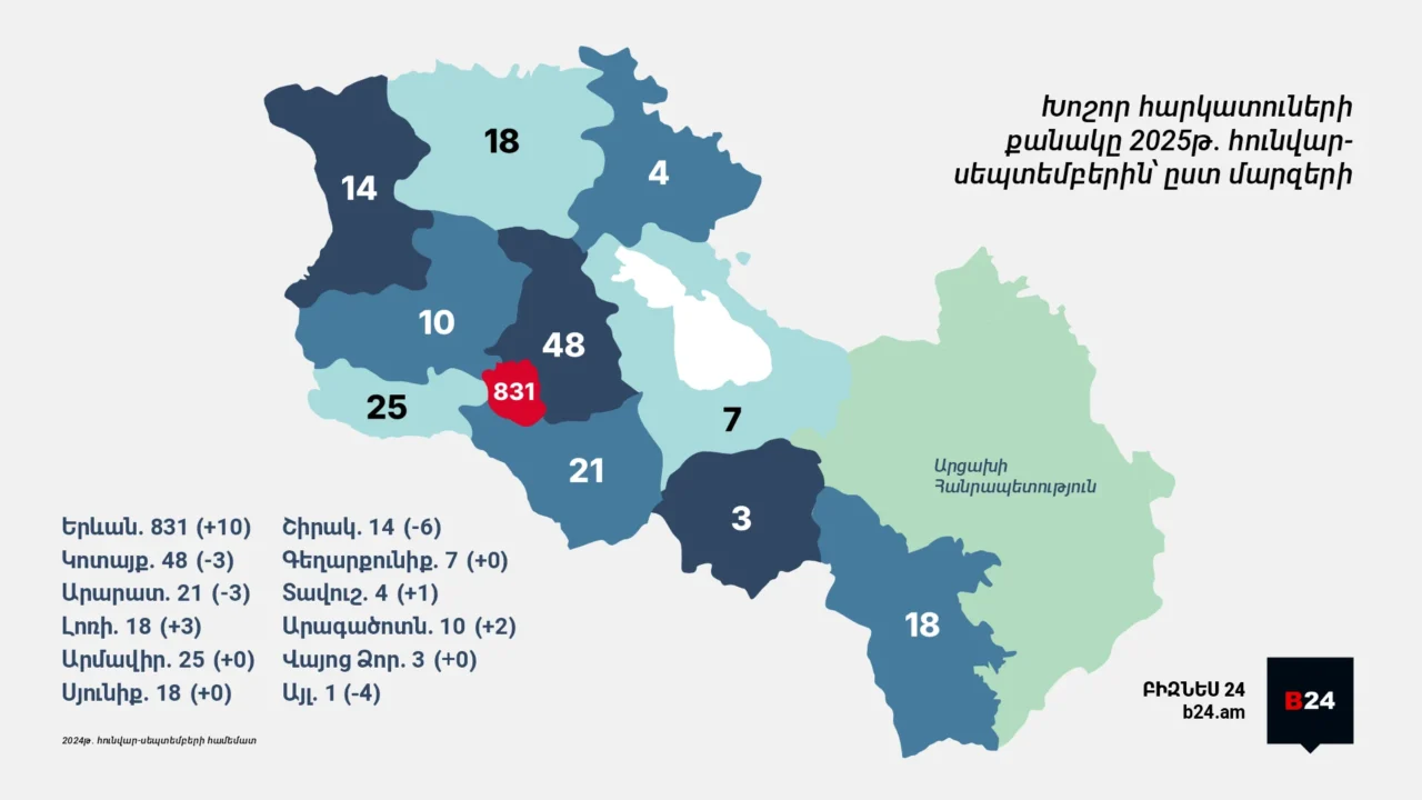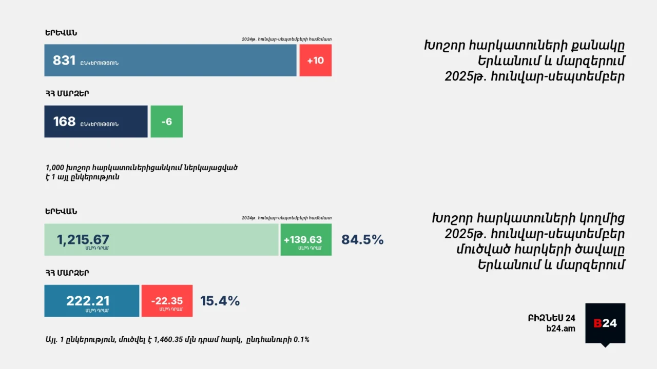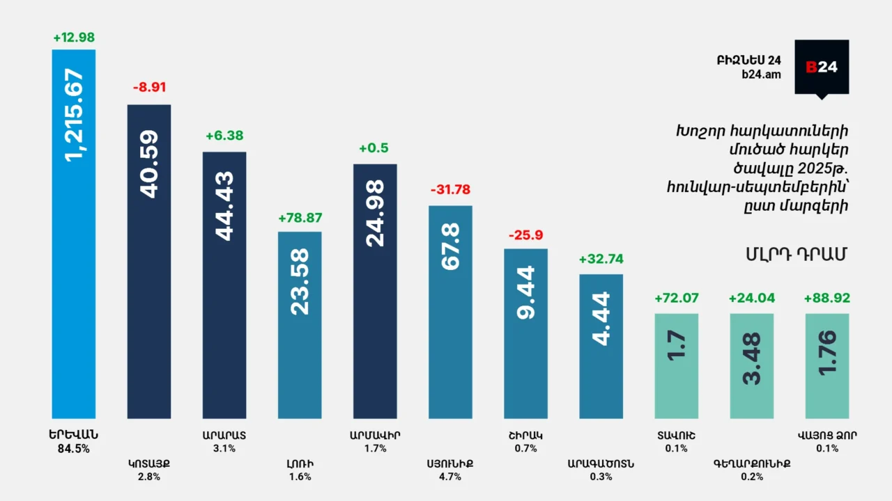 Ինֆոգրաֆիկա. Հայաստանի 1,000 խոշոր հարկատուների 84.46%-ը ներկայացնում է Երևանը. 2025 թվականի հունվար-սեպտեմբեր