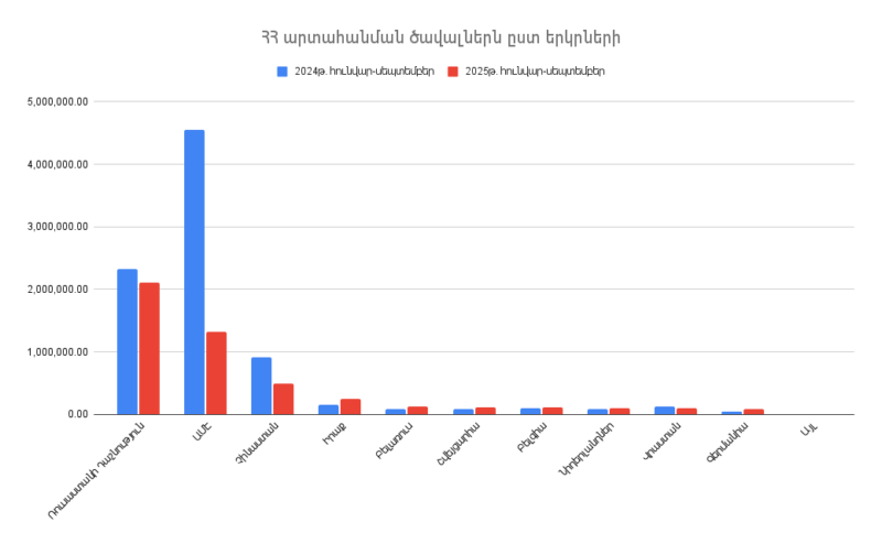 ՀՀ վիճակագրական կոմիտեի հրապարակած տվյալների համաձայն 2025թ. հունվար-սեպտեմբերին Հայաստանի արտահանման ծավալը կազմել է 5․66 մլրդ դոլար։ 2024թ. համադրելի ցուցանիշի համեմատ արտահանման ծավալներն նվազել են 46․81%-ով կամ 4․98 մլրդ դոլարով։