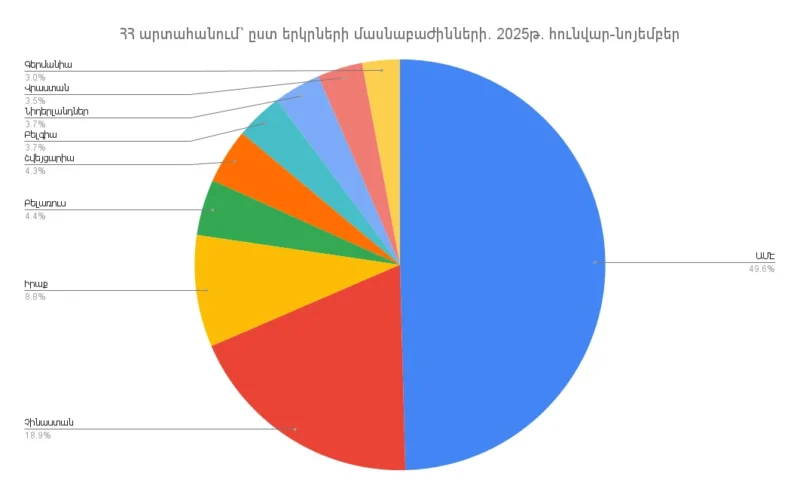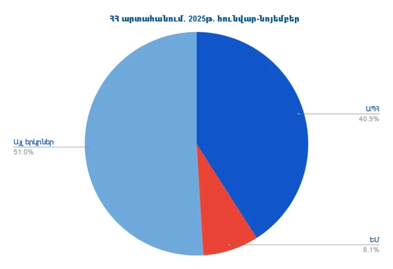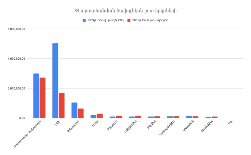 ՀՀ վիճակագրական կոմիտեի հրապարակած տվյալների համաձայն 2025թ. հունվար-նոյեմբերին Հայաստանի արտահանման ծավալը կազմել է 7․35 մլրդ դոլար։ 2024թ. համադրելի ցուցանիշի համեմատ արտահանման ծավալներն նվազել են 40․58%-ով կամ 5․02 մլրդ դոլարով։