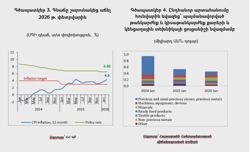 - Փետրվարին գնաճը շարունակեց աճել՝ հասնելով 4․3 տոկոսի, մեծ մասամբ պայմանավորված սննդամթերքի գներով։