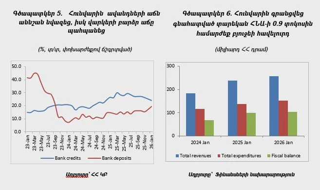 Հունվարին գրանցվեց գնահատված տարեկան ՀՆԱ-ի 0.9 տոկոսին համարժեք ընդհանուր բյուջեի հավելուրդ՝ նախորդ հունվար ամիսներին նկատված օրինաչափությանը համահունչ։ Հունվարին ընդհանուր եկամուտներն ու դրամաշնորհներն անվանական արտահայտությամբ աճեցին 7.5 տոկոսով (տ/տ)։ Հարկային եկամուտները (այդ թվում՝ հիփոթեքի հետ կապված եկամտային հարկը) ավելացան 7.8 տոկոսով (տ/տ), հիմնականում 19 տոկոսով (տ/տ) հավաքված եկամտային հարկի և 6.8 տոկոսով հավաքված ԱԱՀ-ի աճի հաշվին։ Ընդհանուր ծախսերն աճեցին 9.3 տոկոսով (տ/տ)՝ պայմանավորված 21.2 տոկոսով (տ/տ) ընթացիկ ծախսերի աճով, իսկ կապիտալ ծախսերի ծավալը կրճատվեց 67.3 տոկոսով (տ/տ)՝ արտացոլելով 2025 թ. բարձր բազայից պաշտպանության կապիտալ ծախսերի 64.8 տոկոսով (տ/տ) նվազումը։ Հունվարին առողջապահության ընթացիկ ծախսերը գրեթե եռապատկվեցին (տ/տ)՝ պայմանավորված պետական առողջապահական ապահովագրության ներդրմամբ։