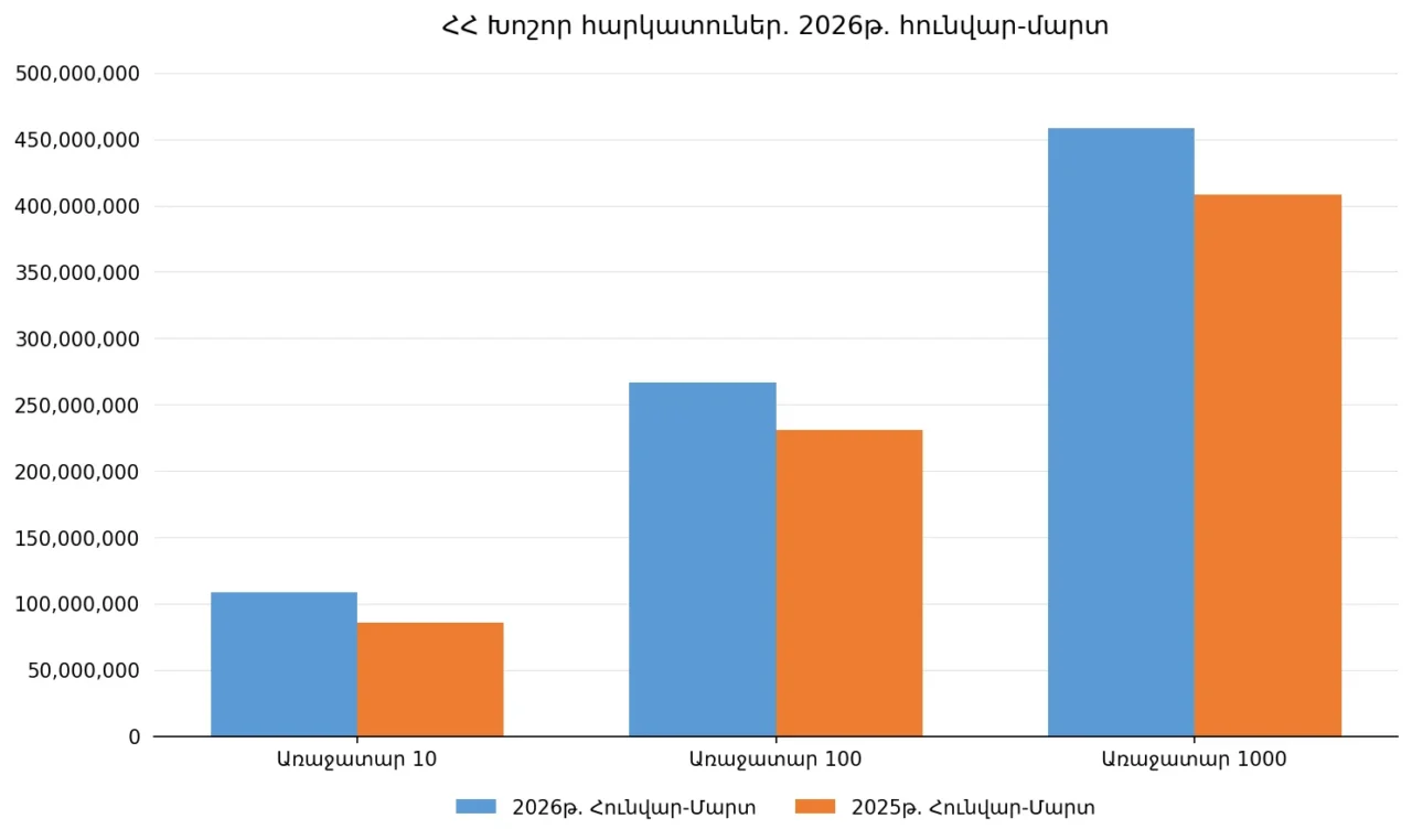 Ընդհանուր առմամբ, առաջատար 10 հարկատուների կողմից 2026թ. հունվար-մարտ ամիսներին վճարվել է շուրջ 108.41 մլրդ դրամ հարկ, ինչը 2025թ. համադրելի ցուցանիշից ավել է 26.23%-ով կամ 22.53 մլրդ դրամով (2025թ․ ցուցանիշը՝ 85.89 մլրդ դրամ)։