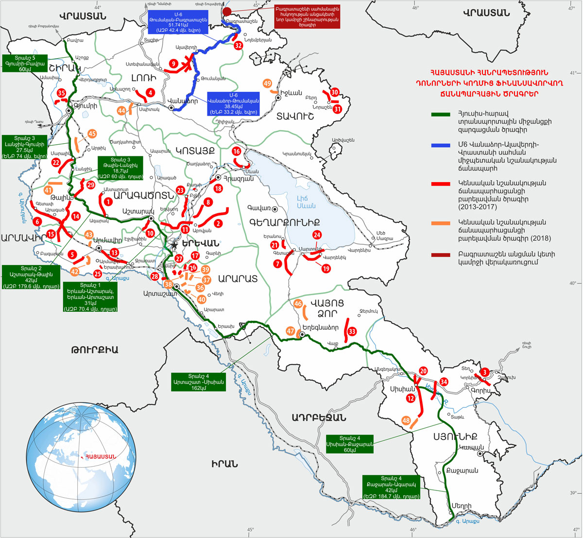 2017թ. Համաշխարհային բանկի աջակցությամբ իրականացվող Կենսական նշանակության ճանապարհացանցի բարելավման 2 ծրագրով կատարվեց 6.8 մլրդ դրամի աշխատանք, այդ թվում՝ հողային աշխատանքներ – 64,541 խմ, հենապատերի կառուցում՝ 3,955 գծմ, գաբիոններ՝ 1,172 խմ, ջրահեռացման համակարգի վերականգնում՝ 17,691 գծմ, մայթեր՝ 19,502 գծմ, կամուրջների նորոգում՝ 24 հատ, ասֆալտապատում՝ 48.5 կմ: