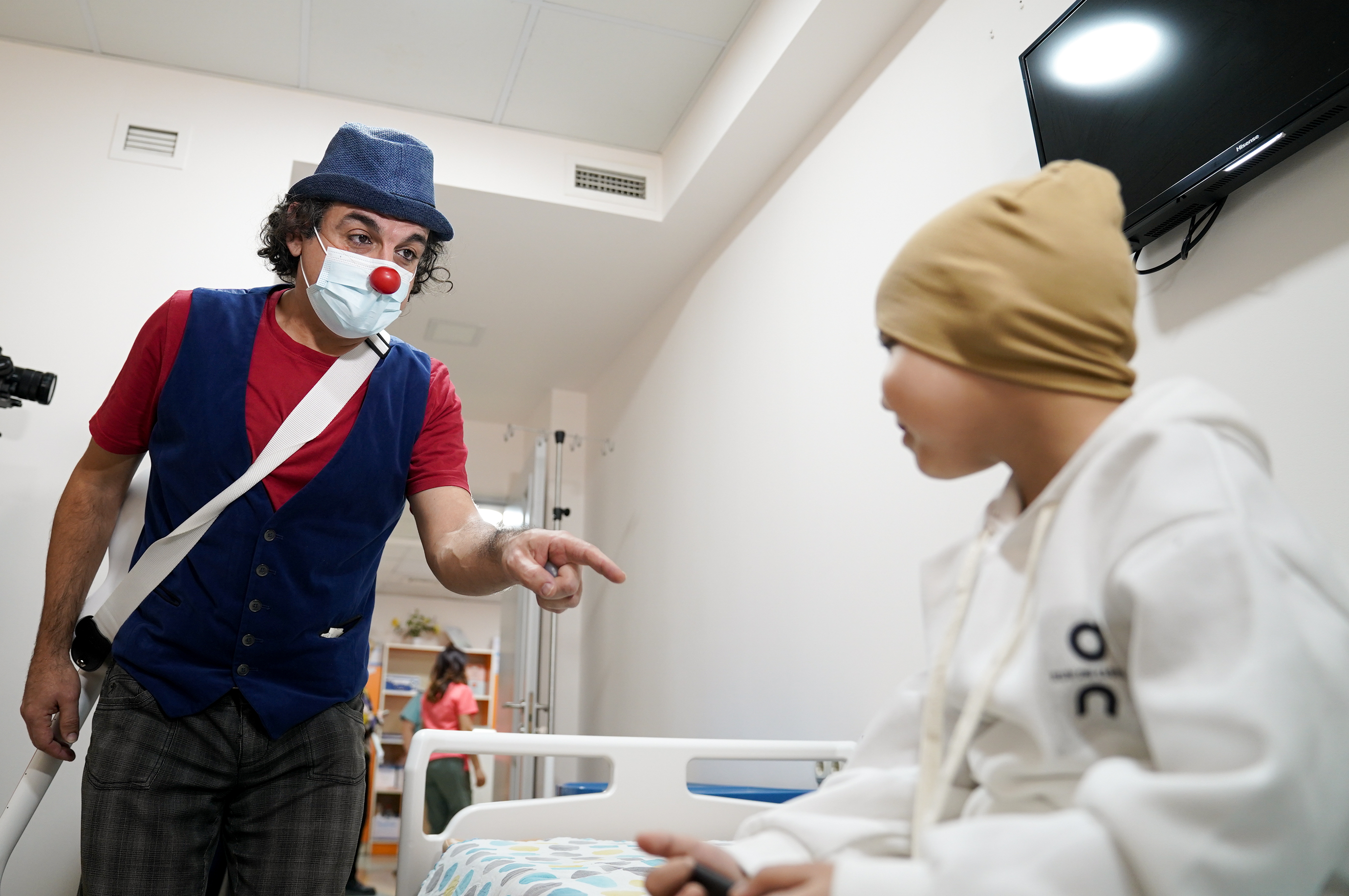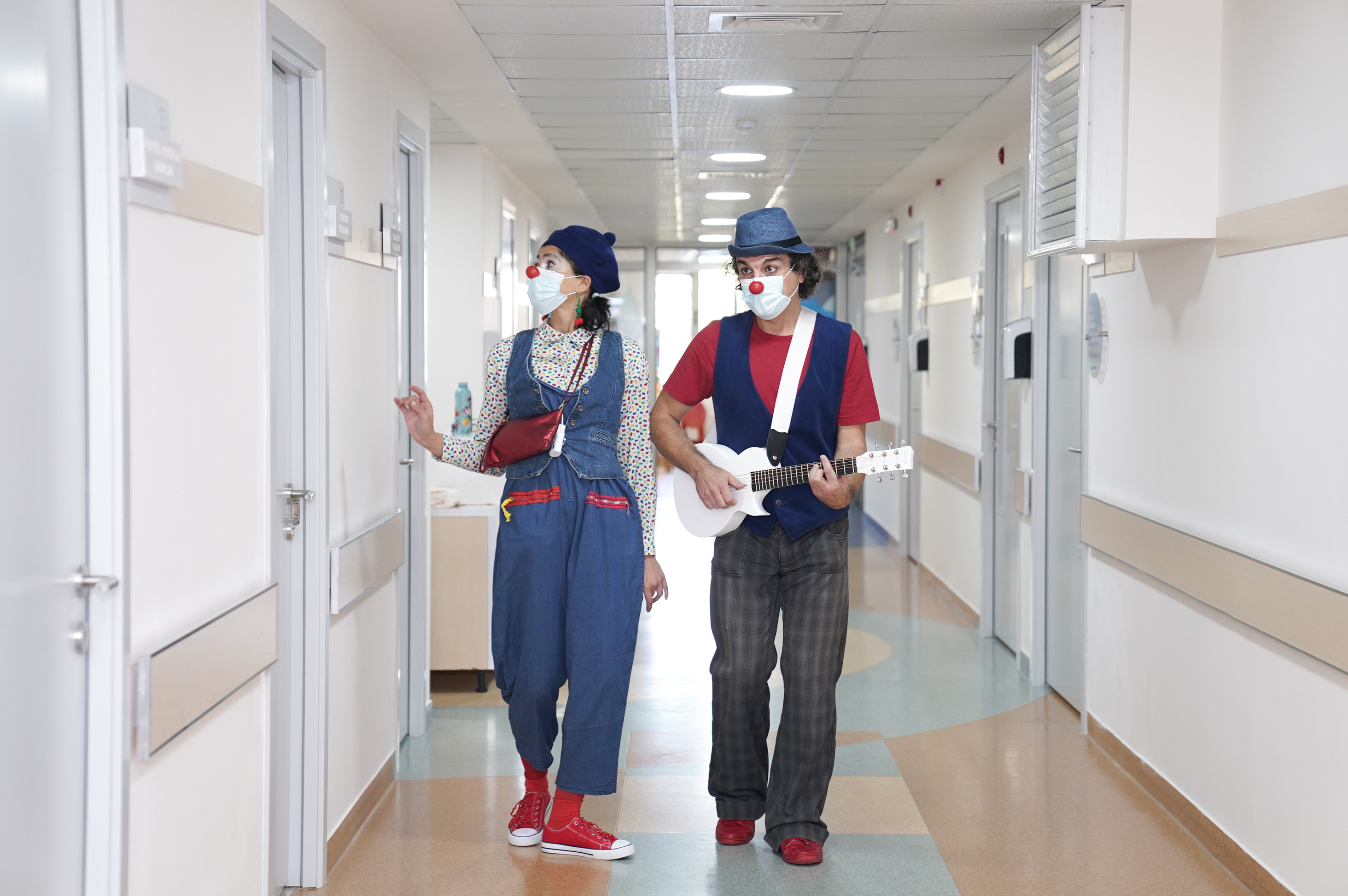 The hospital wards are filled with children of different age, each with their own story. The performers enter the rooms carefully: one is sleeping, another one reading, and the third one watching their performance with wide-open eyes. For the youngest patient, the clowns sing gently, while with the reader they exchange playful glances.