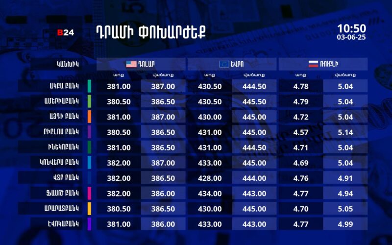 Դրամի փոխարժեք` ՀՀ բանկեր. 10:50, 03/06/25