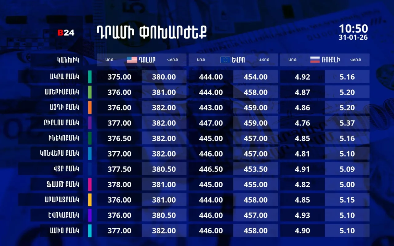 Դրամի փոխարժեք` ՀՀ բանկեր. 10:50, 31/01/26