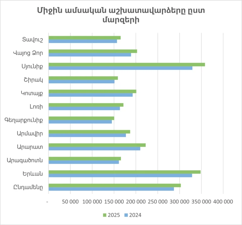2025 թ․-ին ամենաբարձր միջին ամսական աշխատավարձը գրանցվել է Սյունիքի մարզում՝ 358,347 դրամ, 2024 թ․-ի համադրելի ցուցանիշի հահեմատ գրանցվել է 8․7% աճ։